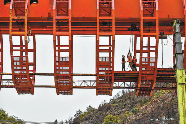 4月10日,浙江省台州市杭温高铁仙居特大桥施工现场,工人正在安装桥梁挂篮模板。