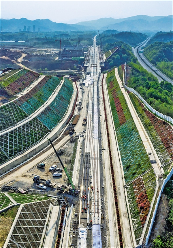 这是4月12日在郑万高铁南漳站拍摄的中铁十一局无砟轨道施工现场(无人机照片)。目前,经过中铁十一局等参建单位建设者艰苦奋战,郑万高铁湖北段进入无砟轨道施工冲刺。郑万高铁全长818公里,设计时速350公里,起于郑州南站,经过湖北、重庆,终到万州北站。新华社记者 杜华举摄