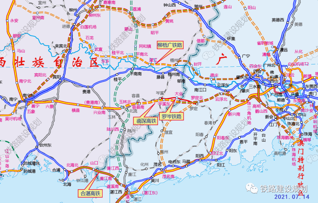 铁路方面,按照广西现阶段规划方案,广西对接粤港澳大湾区共规划建设11条铁路通道。其中,“十三五”末已建成“2高2普”4条铁路通道(南广高铁、贵广高铁、益湛铁路、黎湛铁路);“十四五”期间,广西将新增“2高2普”4条铁路通道(南深高铁南宁至岑溪段、柳州至广州铁路柳州至梧州段、合湛高铁、岑罗铁路),即至“十四五”末广西对接粤港澳大湾区将建成“4高4普”8条铁路通道;其余3条(贵港经玉林至湛江高铁、柳州经贺州至韶关铁路、贺州至永清广高铁(连州)连接线)将视经济社会发展需要积极推进。