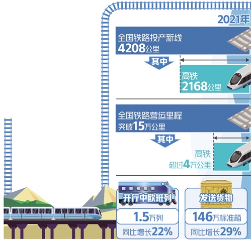 总量提升的同时,我国铁路网络布局越来越完善,作用日益凸显。2021年,我国建成西藏第一条电气化拉林铁路,实现川藏铁路全线开工建设,有效带动铁路沿线经济发展;铁路发挥路网统一调配优势,保障了关系国计民生的电煤和重点物资运输;中老昆万铁路实现开通运营,统筹“一带一路”国际国内铁路连通;中欧班列逆势大幅增长,保障外贸运输稳定畅通……“十四五”开局之年,铁路建设持续为我国构建新发展格局夯基筑路。