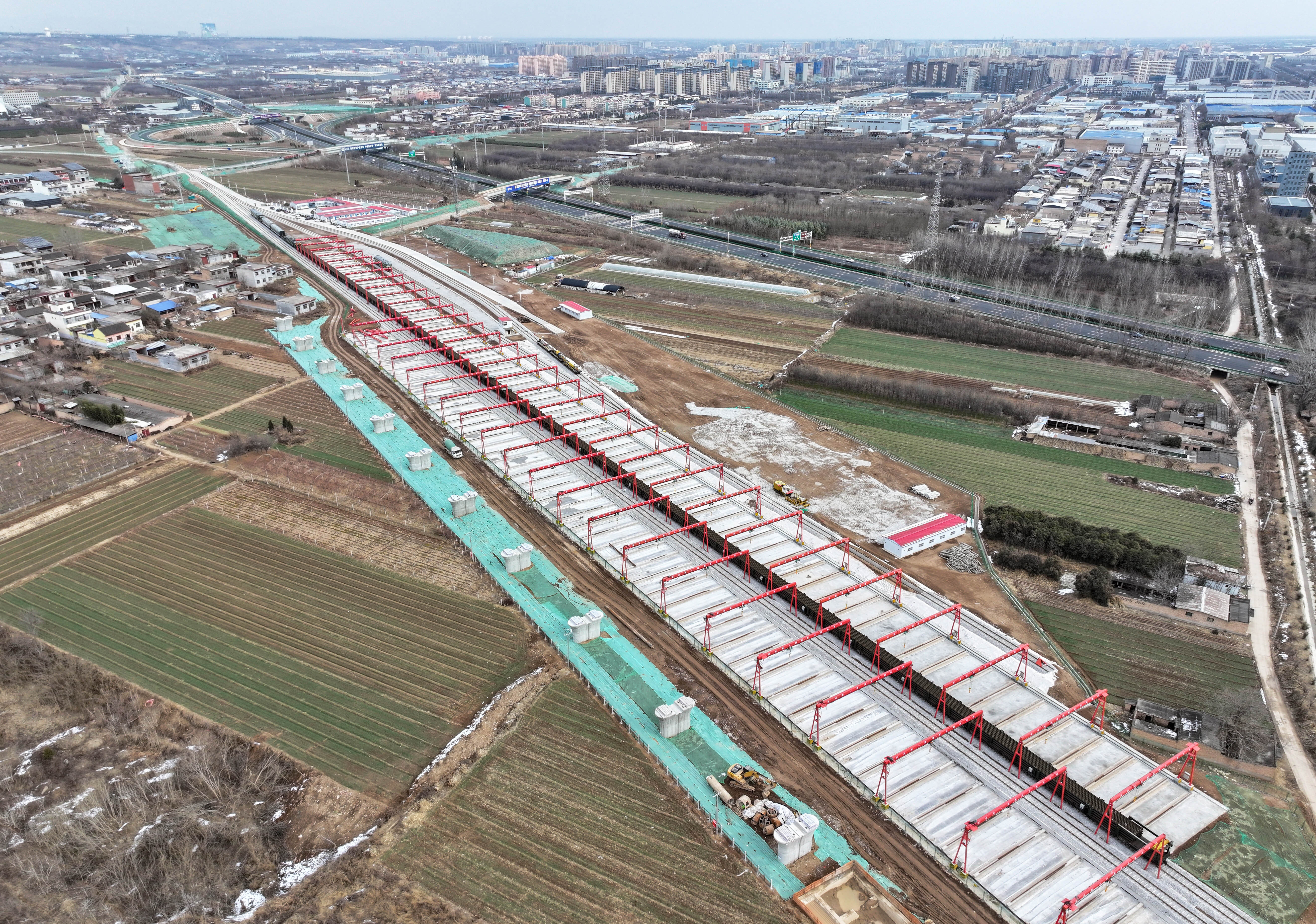 这是1月21日拍摄的中铁十一局西延高铁阎良铺轨基地(无人机照片)。新华社记者 张博文 摄
