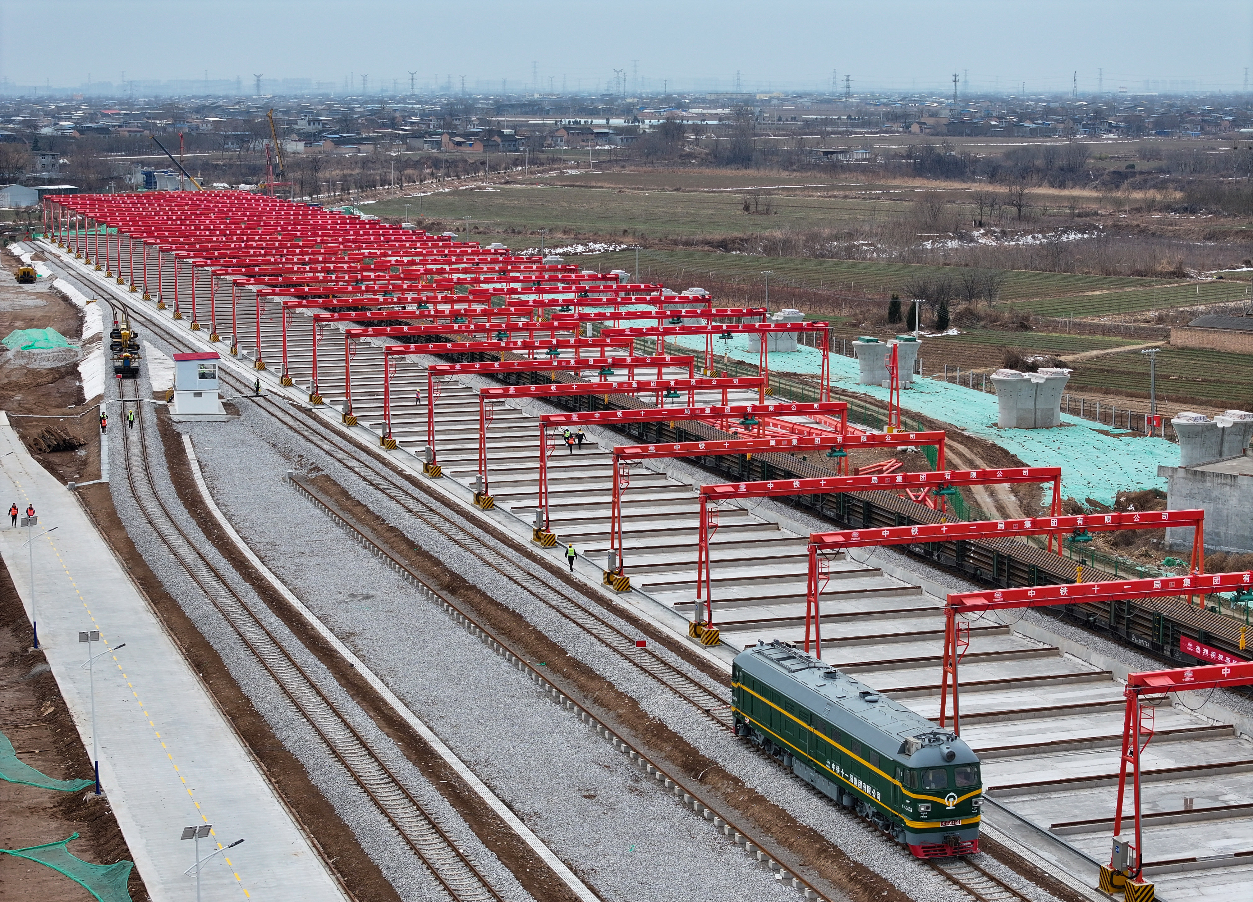 1月21日,一列运载500米长钢轨的列车驶入中铁十一局西延高铁阎良铺轨基地(无人机照片)。新华社记者 张博文 摄