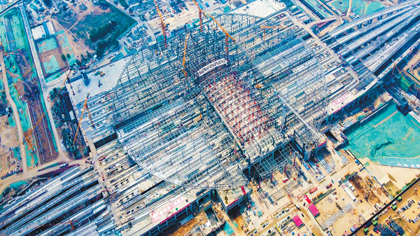 7月8日,京雄城际铁路雄安站屋盖雨棚及高架层钢结构施工正在有序推进。雄安站是京雄城际铁路规模最大的新建车站,站场总规模11台19线,总建筑面积47.5万平方米,站房造型犹如荷叶上的一滴露珠。