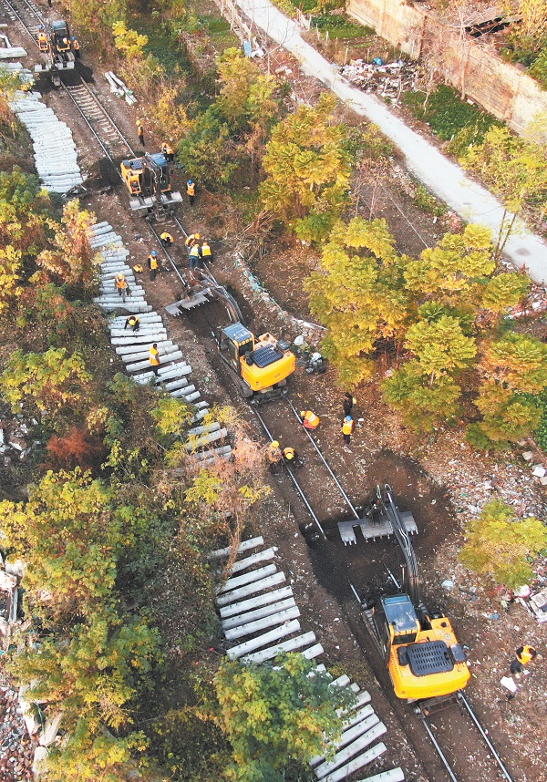 近日,铁路职工利用12台新型多功能换枕车在待王至焦作联络线进行施工作业。这种新型多功能换枕车由郑州铁路装备制造有限公司自主研发,120分钟可更换混凝土枕木60余根,较过去人工换枕效率提升近20倍,为铁路安全高效运输提供了有力保障。赵 庆 摄
